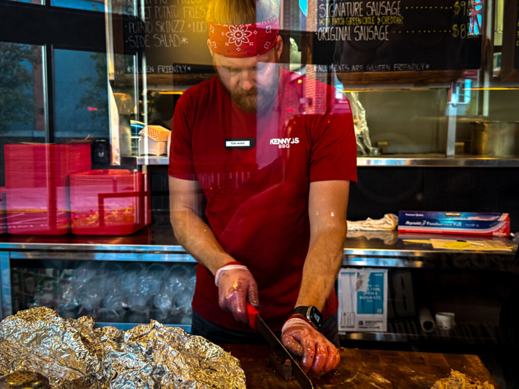 The staff at Kenny J’s are very helpful and a super friendly dude named (for real) Tom Hanks sliced up our meats and gave suggestions about serving amounts. In the end, we wound up with enough BBQ and sides for three different meals for two people for around $60 – a great bang for the BBQ buck.