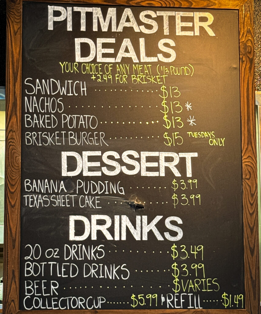 I mentioned that Kenny J’s doesn’t do standard BBQ plates/platters. However, they do offer “Pitmaster Deals” such as Sandwiches ($13); Nachos ($13), Baked Potato ($13); and a Brisket Burger ($15/Tuesdays only), to which you can add your choice of any meat (one-third pound) or Brisket for an additional $2.49. There are also desserts and beverages, including beer.