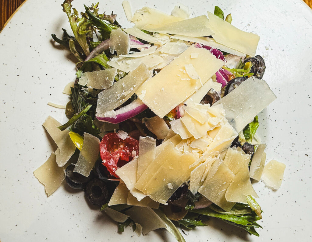 Salads include an Italian Salad ($18), Gem Salad ($20), Caesar ($8/$14) and Versante Salad ($8/$14), plus a soup option of Roasted Cauliflower Soup. The Versante salad is loaded with flavor: fresh greens tossed with tomato, red onion, black and green olives, pepperoncini, and a generous portion of shaved parmesan, drizzled with Italian vinaigrette.