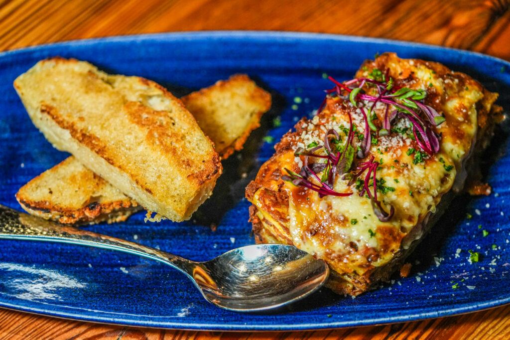 Milia Romagna Lasagna is also featured – fresh sheets of homemade pasta with Bolognese, bechamel, and house five-cheese mix, served with buttery toasted garlic bread slices.