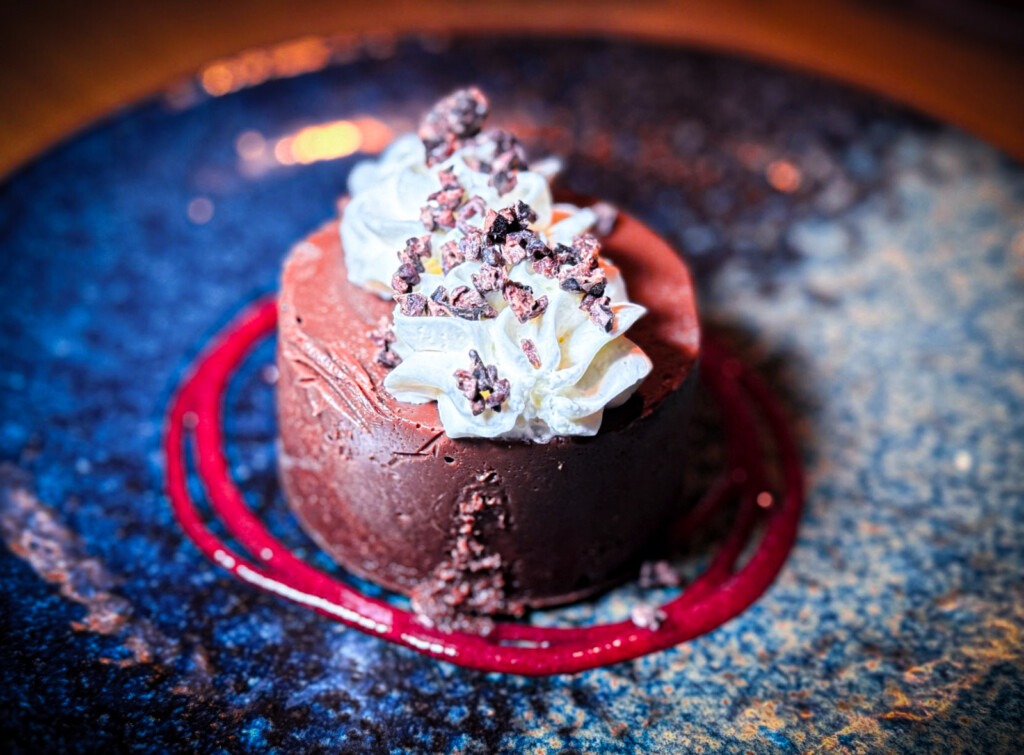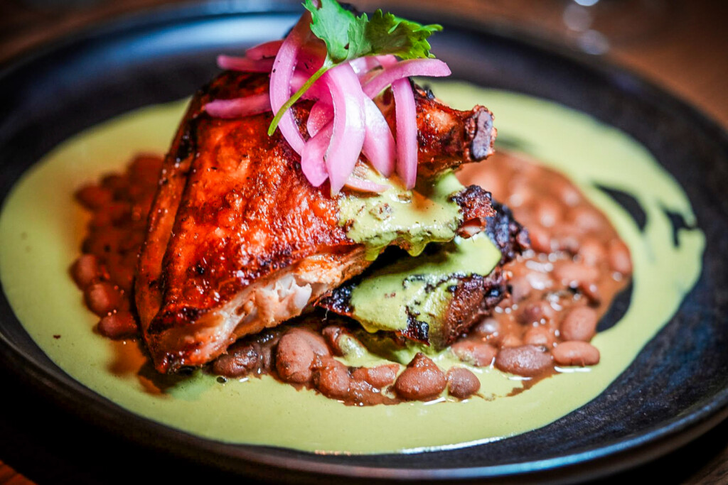 I really loved my entree, which was a Southwestern-style Mary’s Organic Chicken ($29) seasoned with achiote and served with scrumptious Dove Creek bolita beans, pickled red onion, and aji verde. Additional enticing entrees include Pork Tenderloin Medallions with chestnut-porcini crumble and apple gastrique ($35); Herb Falafel ($22) with red pepper, walnuts, muhammara, pickled fennel and beet root hummus; and Birria Tacos ($24) with Oaxaca cheese, Spanish rice and refried black beans.